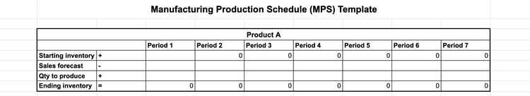 Download our free MPS template to establish a basic production schedule for your facility. Schedule your inventory, forecasts, and quantities for four products across seven periods or more.
