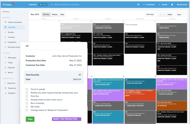 Printavo also offers a Power Scheduler that helps schedule jobs, delegate tasks, and monitor ongoing projects. Its entry-level Lite plan costs $109/month and only includes 20 monthly quotes and invoices. So print shops will have to upgrade to the higher-tier plans for unlimited invoices and advanced scheduling tools.